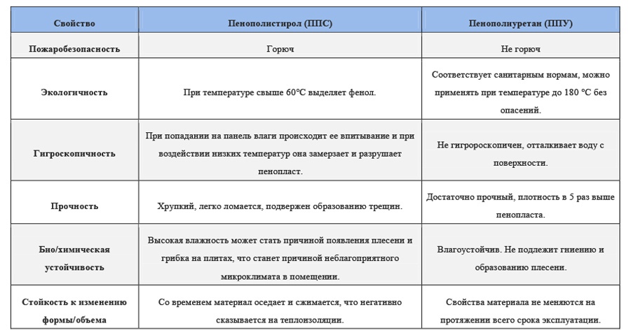 Результаты сравнения пенополиуретана и пенополистиролаДля удобства восприятия результаты сравнения мы вынесли в отдельную таблицу. |